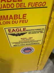 Description: Model 1903. 4-gallon capacity flammable liquid storage cabinet. Meets OSHA requirements. Constructed in accordance with NFPA, UL, and FM standards. Manufactured by Eagle Manufacturing Company, Wellsburg, WV. Voltage, frequency, power consumption, fuse rating, and software version are not applicable for this product.