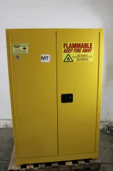 With dimensions of 44.0" L x 19.0" W x 66.0" H and weighing 384 lbs (174 kg), the cabinet offers a compact footprint while providing essential flammable liquid containment for research labs handling combustible solvents and reagents. The unit’s sequential self-indexing door closure mechanism supports secure access control, vital in tightly regulated molecular biology and synthetic biology labs.