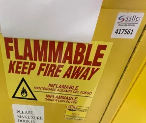 The Eagle Manufacturing Company Model 1905 is a 16-gallon flammable liquid safety storage cabinet designed specifically for secure containment of flammable chemicals in laboratory, industrial, and biotechnology environments. Constructed with robust steel material and featuring a single locking door, it meets OSHA regulatory requirements and is compliant with NFPA No. 30 standards for flammable liquid storage.