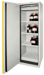 The CHEMISAFE FIRE 60 BASIC is an expertly crafted fire safety cabinet constructed from 1 - 1.5 mm thick electrogalvanized sheet steel, finished with an acid-resistant epoxy resin exterior. Its gray RAL 7035 design incorporates high-density rock wool and calcium sulphate panels for superior insulation, complying with EN14470-1 standards. The automatic door-closing mechanism activates when temperatures exceed 50 °C, ensuring protection and integrity. Certified for 90 minutes of fire resistance by Bureau Veritas, this cabinet features anti-spark hinges, grounded stability, and adjustable leveling feet. A robust closed-loop system allows for automatic closure of the air ducts at temperatures over 70 °C. Equipped with customizable shelving, a retention tray, and secure locking system, this model accommodates an array of optional features including ventilation systems and cooling units for ultimate flexibility and safety in hazardous material storage.