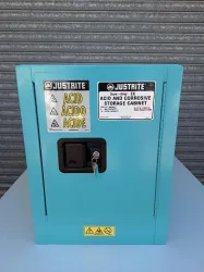 This Justrite storage cabinet is designed for acids and corrosive materials, offering the same high-quality safety features as their flammable cabinets. Ensuring optimal safety, the cabinet includes double-wall construction, dual vents, grounding wire connections, adjustable shelves, leak-proof sills, and three-point self-latching doors with leveling feet. The manual-close door opens fully to 180 degrees and securely self-latches when closed. It is constructed from durable 18-gauge steel and meets OSHA and NFPA Code 30 compliance standards. The model is ready for immediate use, featuring a 4-gallon capacity, one shelf, and is constructed in a distinctive blue color. Exterior dimensions measure 22" H x 17" W x 17" D (559mm H x 432mm W x 432mm D) and an interior capacity providing plenty of room for hazardous materials.