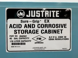 The Justrite Sure Grip EX Acid Cabinet provides secure, NFPA Code 30- and OSHA-compliant storage for acids and corrosive chemicals, essential in biotechnology laboratories and chemical research facilities. This 45-gallon (170-liter) capacity cabinet is engineered with durable materials to resist corrosion and ensure long-term chemical containment. Its design supports safe handling of hazardous reagents in molecular diagnostics, bioprocessing, and synthetic biology workflows. The cabinet’s robust construction and user-centric safety features make it critical for compliance and risk mitigation in environments requiring strict chemical storage protocols. Widely adopted in biopharmaceutical production pipelines and clinical diagnostics laboratories where flammable and corrosive materials must be stored separately and securely.