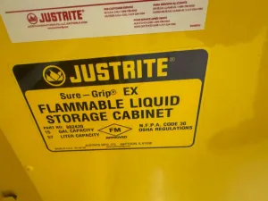 The Justrite Sure-Grip EX Model 882420 flammable liquid storage cabinet is engineered for the safe containment of hazardous chemicals commonly used in biotechnology, molecular diagnostics, and bioprocessing laboratories. Constructed from yellow powder-coated steel, this single-cabinet system features a 15-gallon (57-liter) capacity with an adjustable shelf to accommodate various container sizes. Designed to meet stringent OSHA and NFPA Code 30 safety regulations, it ensures compliance for safe storage of volatile solvents and reagents essential in synthetic biology research and biomanufacturing environments.
