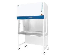 The ESCO Airstream Plus AC2-5E8-TU is a 1.5m microbiological safety cabinet designed to offer robust protection and reliable performance in the lab. This model is TüV NORD EN 12469 certified, ensuring high standards of safety. It features automatic regulation, a malfunction alarm, and a dry contact for alarm reporting. Equipped with dual economical motors, it guarantees stable flow control. The removable stainless steel worktop offers a spacious work area and is inclined for liquid retention. Additional features include LED lighting, a clear control panel that displays flow and window position, and silent operation. The unit includes a UV-30A UV lamp, leveling feet support stand (SAL-5A0 GEN2), and two internal sockets. Despite minor deformations on the sheet metal slide covers, the cabinet operates without interference in function. Produced in 2016, this cabinet remains in pristine condition in its original packaging.