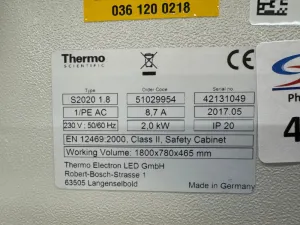 The Thermo Fisher Scientific Thermo Safe 2020 S2020 1.8 is a Class II biosafety cabinet engineered for rigorous contamination control in laboratory environments, particularly suited for molecular diagnostics, bioprocessing, and synthetic biology applications. This model offers a spacious working volume of 1800 x 780 x 465 mm, accommodating a broad range of biotechnology workflows including gene editing and cell imaging procedures.