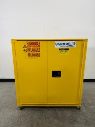 The VWR 30 Gallon Flammable Liquid Storage Cabinet is engineered for safe and compliant storage of flammable and combustible liquids in laboratory and industrial settings. This chemical storage cabinet features a bright yellow finish with clear hazard labeling, ensuring high visibility and adherence to safety protocols. Designed according to safety standards, it securely stores up to 30 gallons of volatile chemicals, minimizing fire risk in research environments focused on biotechnology, molecular diagnostics, and bioprocessing workflows. This cabinet is a critical component in facilities requiring stringent flammable liquid containment, supporting applications in biopharmaceutical production pipelines and synthetic biology research where proper hazardous material storage is mandatory. Its robust construction makes it suitable for clinical diagnostics labs and biomedical engineering contexts requiring safe handling and storage of flammable reagents and solvents. Voltage, frequency, and power specifications do not apply, as it is a passive safety storage unit.