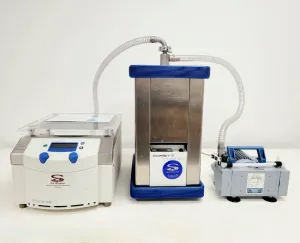 The Christ Rotations Vacuum Concentrator System, RVC 2-25 CT 02-50, is expertly designed for efficient solvent evaporation and sample concentration. Recently sourced from a university laboratory as surplus equipment, the system has been tested and is in excellent operational condition, with all components powering up effectively. Additionally, the system maintains a good cosmetic condition, displaying only minor surface marks. This comprehensive system includes the Christ RVC 2-25 (Type - 100225) and the Christ CT 02-50 (Type - 100502), paired with a Vacubrand Diaphragm Vacuum Pump, Model MZ 2C. Ideal for laboratory settings requiring precise and reliable vacuum concentration processes.