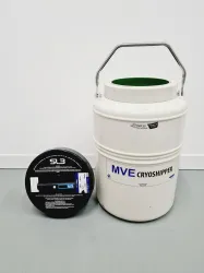 The MVE CryoShipper, with an 8.5-liter capacity, is a robust nitrogen dewar designed for the secure transport of cryogenic samples. Originally surplus from a university, the unit is in good cosmetic condition, though untested at our facility. It features a neck opening of 216 mm, overall height of 546 mm, and an outside diameter of 369 mm. A ShipsLog 3 Temperature Lid is fitted, though the data log is not included. The last calibration occurred on January 4, 2021, and the last service on June 4, 2021.