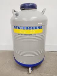 The Statebourne Bio 35 Liquid Nitrogen Dewar is a robust cryogenic storage solution, previously utilized in a university laboratory setting. It is in good cosmetic condition despite not being tested at our facility. This double-walled vacuum vessel is ideally designed to safely contain and maneuver cryogenic liquids and comes equipped with six metal cylinders for additional storage capacity.