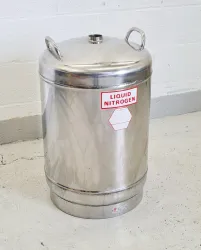 The Wessington Cryogenics ES-60 is a 60-liter liquid nitrogen storage Dewar tank, previously utilized in a university laboratory setting where it became surplus to their requirements. While the unit has not undergone testing, it is in good cosmetic condition with only minor marks indicative of standard use. It is a 1995 model, offering reliable LN2 storage, making it ideal for controlled laboratory environments requiring dependable cryogenic storage solutions.