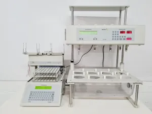 This Varian VK 8000 Dissolution Sampling Station was extracted from a university lab, deemed surplus. The unit is in good cosmetic condition and powers up; however, further testing was not possible at our facility. The VK 7010 unit can accommodate 8 vessels of 1-litre capacity and 8 stirring drive shafts, but it is missing stirrers and vessels. Additionally, no paddles or spindles are attached to the chucks on the drive shafts.