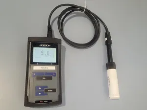 The WTW OXI 3205 Portable Oximeter, coupled with the Cellox 325 Probe, is an advanced waterproof instrument designed for measuring dissolved oxygen levels with precision. It operates efficiently under diverse environmental conditions, thanks to its automatic atmospheric pressure compensation ranging from 500 to 1100 mbar and robust protection class of IP 67. This device features a backlit graphic LCD for clear visualization of data. With a dissolved oxygen measuring range from 0.00 to 90 mg/L, an accuracy of ±0.5%, and a high resolution of 0.01, 0.1 mg/L, it ensures reliable results for professional use. The oximeter operates with 4 x 1.5 V AA rechargeable batteries or 4 x 1.2 V NiMH rechargeable batteries, and functions effectively in temperatures ranging from -5 to 50°C. Weighing just 2 kg, it is an ideal choice for field and laboratory settings.