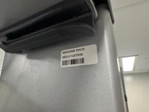 The Innovive Double Sided Mouse Rack (Model INNOVIVE RACK, Serial No. 1207949) is a specialized laboratory animal cage rack designed for efficient housing and management of multiple mouse cages. This rack provides dual-sided shelving that maximizes animal capacity while maintaining essential environmental control through integrated airflow modules positioned at the top corners, ensuring consistent ventilation critical for laboratory animal welfare.
