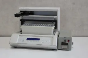 The Gilson FC 203B Fraction Collector is adept for collecting a variety of aggregate samples such as microplates, vials, and tubes. Equipped with an intuitive built-in keyboard, it facilitates simple and efficient installation and operation, seamlessly integrating with your HPLC system. With flexible collection options—by time, dip, or peak—it adapts to varying chromatographic conditions. It features a 3-port PTFE67uL with an internal volume of 3.5ul, detector input of ± 100mV full scale, and a programmable time unit ranging from 0.01 to 99.9 minutes. The maximum collection volume is a 20ml tube at a maximum speed of 20 drops per second. Compact in design, it measures externally at 29 x 33 x 28 cm and internally at 22.5 x 8 cm, while weighing 5 kg.