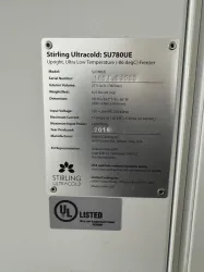 The Stirling Ultracold -80 Ultra Low Temp Freezer employs advanced Stirling engine technology to deliver reliable, energy-efficient ultra-low temperature storage at -80°C, essential for long-term preservation of sensitive biological samples. This upright single compartment freezer features a digital control panel for precise temperature management, making it critical equipment in biotechnology and molecular diagnostics workflows. Its dimensions of 28.5 in (W) x 32.5 in (D) x 70 in (H) and approximate weight of 350 lbs provide a robust footprint suitable for biobanking, synthetic biology, and clinical research labs. Operating at 115 V and 60 Hz, this model manufactured in 2016 supports stable sample storage protocols required in fields like gene editing, bioprocessing, and cell imaging. The freezer is widely adopted in biopharmaceutical production pipelines where reliable ultra-low temperature environments are mandatory.