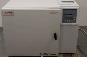 The Thermo Fisher CryoMed 7451 Controlled-Rate Freezer includes a rack system with 5 trays, each featuring 76 holes. These holes have a diameter of 14mm and a height capacity of 50mm, offering precise, efficient freezing for a variety of sample types. Ideal for applications requiring stringent temperature control and sample preservation integrity.