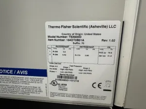 The Thermo Fisher Scientific TSX600D ultra low temperature freezer is engineered for precise and reliable storage of biological samples at -80°C, making it essential equipment for biotechnology laboratories, molecular diagnostics, and biorepository applications. This TSX Series freezer employs an advanced V-Drive system that enhances operational efficiency and reduces power consumption, rated at 4.2 kW under a voltage supply of 208-230 V and frequency of 60 Hz with a fuse rating of 20 A.