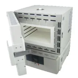 Standard 23.6L muffle furnace using microprocessor-controlled thermo-regulator characterized by excellent repeatability. Used for high temperature applications such as fusing glass, creating enamel coatings, ceramics and soldering and brazing metals. Easy to use controller. Excellent heat tightness with a firmly sealed chamber door. High temperature accuracy at ±2.0°C. Program operation of maximum of 6 patterns: 30 steps x 1 pattern, 15 steps x 2 patterns or 10 steps x 3 patterns. Safety features include self-diagnostic functions, calibration off-set, lock function, auto-recovery after power failure, earth leakage breaker and automatic overheat prevention device. Selectable options include exhaust system unit, N₂ gas loading device (with flow meter), temperature output terminal, time up/alarm output terminal and sample tray. Upgraded with long life R-thermocouple sensors. Designed with communication port. Temperature range: 100~1150°C.