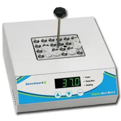 Benchmark One-Block Digital Dry Bath Benchmark Digital Dry Baths provide accurate “set and walk away” digital temperature selection, eliminating the need for external thermometers and repetitive “fine tuning” of a temperature control knob. Simply enter the desired temperature on the digital touchpad and the Benchmark Dry Bath provides accurate temperature with real time monitoring that continuously maintains the selected temperature within ±0.2C. In addition, a digital timer is built into the touchpad display. Although it is not designed to shut off the heater, it can be used to alert the user that a chosen time interval has timed out.