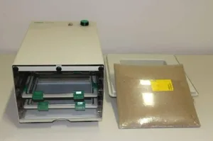 The Bio-Rad GelAir Drying System offers efficient and high-quality drying for polyacrylamide and agarose gels. Designed to produce clear, glossy gels, it is perfect for applications such as densitometry, photodocumentation, autoradiography, and long-term storage. The system operates with a heated drying chamber, similar to a convection oven, and can dry mini gels in 45 minutes or larger 20×20 cm gels in 60 minutes, surpassing traditional dryers that require vacuum pumps. Drying times are influenced by gel percentage and thickness. Capable of holding up to four drying frames concurrently, the system includes a fully adjustable timer from 0 to 3 hours and offers modes for fan only, fan with heat, or off. The dryer dimensions are 27x43x30 cm with a weight of 8 kg. Each drying frame accommodates 20×20 cm gels with molded polycarbonate and stainless-steel construction, and the system is equipped with drying frames, clamps, an assembly table, and cellophane supports. This comprehensive setup ensures reliability and efficiency for all lab gel drying requirements.
