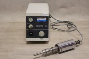 The supply voltage converts AC line voltage to 20kHz electrical energy. This high-frequency electrical energy is fed to a converter where it is converted into mechanical vibrations. The heart of the transducer is a lead zirconate titanate electrostrictive element which, when subjected to an alternating current, expands and contracts. The transducer vibrates in a longitudinal direction and transmits the motion to the horn tip which is immersed in the solution, causing cavitation. The implosion of microscopic bubbles or voids in the solution results, intensively stirring the molecules in the medium. The Sonifier operates in two modes: Pulsed and Continuous. In Pulsed Mode, ultrasonic vibrations are transferred to a solution at a rate of one pulse per second. This pulse duration can be adjusted from 0.1 to 0.9 per second, allowing the solution to be processed at full ultrasonic intensity as the temperature builds up – particularly valuable when processing hot volatile solutions and temperature sensitive material. In continuous mode, the Sonifier can be set for continuous duty.