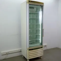 Comersa Unic 300 pharmaceutical refrigerator. Temperature range from +2 ºC to +6ºC. 247 L capacity. Digital control. Alarms on over temperature and open door. Three rod shelves. Flat glass door. Interior lighting. Automatic defrost. Stainless steel exterior, non-toxic white plasticized sheet interior. Power 420 W. External dimensions (heightdepthwidth): 1940620580 mm; 114 kg. Small damage on the left side that does not affect its operation.