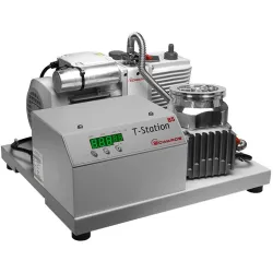 The Edwards turbomolecular pumping stations are a comprehensive range of products providing versatile vacuum solutions in many different applications. All the nEXT turbomolecular pumping stations are supplied fully assembled and ready to run straight out of the box with nEXT turbomolecular pumps and backing pumps that are user serviceable. There are 2 models in the turbomolecular pumping stations range the entry level T-Station 85 and the higher capacity T-Station 300.Both the T-Station 85 and the 300 come with an integrated Turbo and Active Gauge controller which enables single button start/stop of the system. With the ability to control one of the active gauges, vent valve control and delayed start of the turbomolecular pump to either time or pressure if a gauge is fitted, the T-Station 85 ideal for general laboratory needs and the T-Station 300 extending the performance envelope for the R&D sector.nEXT T-Station 85The T-Station 85 is a low cost, compact turbomolecular pumping station that seamlessly combines an nEXT85H turbomolecular pump with either a dry diaphragm or oil sealed backing pump, and a simple controller, providing pumping speeds of 47 to 84 ls-1.INCLUDED: The Edwards T-Station 85H Wet Turbo Station ISO63, 100-120V includes: