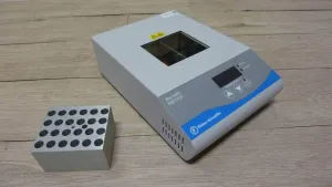 The Fisher Scientific FB15101 Heating Block offers a large digital display for precise temperature readings and control. It features a microprocessor-controlled system ensuring temperature accuracy with a range from ambient +5°C to 150°C, adjustable in 0.1°C increments. The anodized aluminum block is designed to accommodate twenty-four 1.5 mL tubes, providing robust thermal conductivity. This single-block model's user-friendly calibration ensures effortless maintenance of optimal conditions for various laboratory tasks. Ideal for precise thermal regulation applications.