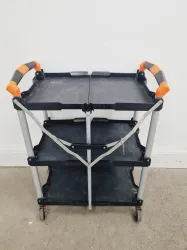 The Foldable 3-Shelf Laboratory Trolley is a practical solution for laboratory needs, offering mobility and efficient storage with its three spacious shelves. Previously sourced from a university lab, this trolley is in fair cosmetic condition, featuring slight rusting on the feet. Its robust foldable design ensures ease of storage and handling, with dimensions of 67 x 42 x 86 cm when open, making it an adaptable addition to any laboratory setting.
