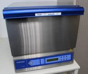 The Getinge 1345 is a high-performance laboratory thermodisinfector designed to efficiently wash and disinfect glassware. It features short processing times and a compact design, making it easy to install in any laboratory setting. Despite its small dimensions (HxWxD: 505 x 500 x 643 mm), it boasts a generous chamber size of 300 x 435 x 485 mm, ensuring ample space for larger loads. Ideal for laboratories that require reliable and thorough cleaning solutions.