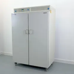 Heraeus B6760 incubator. Capacity 751 L. Temperature range from ambient + 5 ºC to 70 ºC. Temperature Uniformity (37°C): ± 1.5°C; stability ± 0.5°C. Over temperature protection. 24 hour timer. Double door. Includes 5 shelves. Dimensions (HWD): External 18112073cm; inside (HWD): 13410055 cm; weight 239kg.
