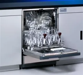 Labconco FlaskScrubber Glassware Washer, undercounter with window Features Achieve higher water temperatures for enhanced washing, faster drying, and sanitizing LCD information center for customizing cycles and monitoring operations, including internal water temperature (C or °F) and alarms High water circulation rates for thorough cleaning: 96 gal./min. (363L/min.) when operated on 115V 60Hz, and 112 gal./min. (424L/min.) on 230V 50/60Hz Dual pumps: one for washing and one for draining, to reduce potential for cross-contamination Built-in purified water pump brings unpressurized or pressurized purified water into tank for up to six pure water rinses
