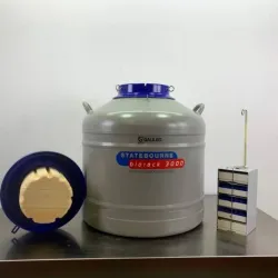 Statebourne Biorack 3000 liquid nitrogen dewar. Total storage capacity of 3,000 2 mL cryovials. Liquid nitrogen capacity of 85 L. Evaporation rate 0.63%/day. Static holding time 1351 days. Neck diameter 216 mm. Aluminum construction. Six racks for 5 boxes each. Includes 24 storage boxes of 81 cryovials each (14 polypropylene Nalgene + 10 cardboard) and dimensions 13013050 mm.. Dimensions (Øheight): 646738 mm, empty weight 42 kg.