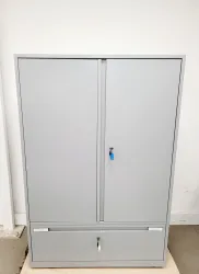 The Triumph Metal Cabinet is a robust storage solution, ideal for laboratory environments. Removed from a university lab where it exceeded needs, this cabinet remains in reasonable, used cosmetic condition. It offers ample storage capacity with two spacious shelves, each measuring 95 x 41.5 cm, and a practical internal drawer with dimensions of L89.5 x W38 x H24.5 cm. The cabinet is secured with two sets of keys, ensuring both safety and accessibility.