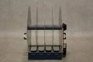 The Rat RotaRod consists of four 6cm diam. cylinders, which are suitably machined to provide grip. Five 49cm diam. dividers make for four lanes, each 8.7cm wide, enabling four rats to be on the rotor simultaneously. The height to fall is 30cm.