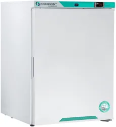 The Corepoint Scientific PF051WWW-0M20 is a freestanding undercounter laboratory freezer designed to maintain temperatures between -15°C to -25°C. It features a microprocessor temperature controller and digital display for precise temperature control and recovery. The unit includes a comprehensive alarm package with audible and visual high and low temperature alarms, as well as remote alarm contacts to ensure the security of critical samples. It has one solid swing door, a keyed lock, and a magnetic door gasket for a positive seal. The freezer is equipped with two fixed shelves, a bottom footed shelf for air circulation, and a back wall evaporator cover. Additional features include a recessed door handle, leveling legs, LED interior light, and a probe access port. The white cabinet and door are insulated with high-density urethane foam, and the freezer uses HFC-free refrigerant (R600a), foam insulation, and packaging for environmentally friendly operation.