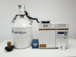 The Planer Kryo 10 Series II, MVE Lab 30 Controlled Rate Freezer System is a comprehensive solution designed for precise cryogenic applications. Recently decommissioned from a university due to surplus, this system is in reasonably good cosmetic condition. The Kryo 10 Series II Freezer and the Biomed MR2 Printer have been tested for power-up and successful pairing, with the printer requiring a passcode obtainable upon request. Testing of the LNP 4-C Freezer and Power Supply is incomplete due to the absence of the power supply cable. The package includes two washers for the Planer Freezer, two spare paper rolls, and a convenient trolley stand with wheels for easy mobility.