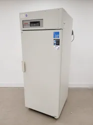 The Sanyo MDF-U730M Biomedical Laboratory Freezer offers dependable and spacious cold storage, formerly used in a university setting where it was deemed surplus. The unit is fully operational upon powering up, although a thermometer is not included. It remains in excellent cosmetic condition, ensuring a professional appearance for any lab. The unit comes equipped with six shelves, each measuring 62 x 62 cm, and fourteen containers measuring 62 x 31 x 16 cm, providing ample storage space for various laboratory needs.