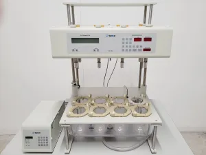 The Vankel VK 7010 Dissolution System with VK 750D Heater/Circulator is an ideal solution for precise dissolution testing in pharmaceutical environments. This unit was sourced from a university laboratory where it was deemed surplus. It powers up and functions properly, having been validated with a digital thermometer (not included). While further testing at our facility is not possible, the system was confirmed to be in full working order prior to removal from the lab. The item remains in good cosmetic condition, displaying only minor signs of previous usage. Please note that printer paper is not included. The package comes with 2 power cables and 2 data cables for immediate setup.