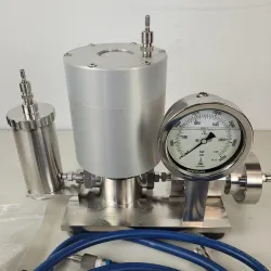 The Avestin EmulsiFlex-C5 is a high-pressure, pneumatically powered homogenizer specifically designed for laboratory-scale applications. Engineered to process sample volumes from 7 mL to 5 L/h, it operates effectively depending on the pressure applied, up to 30,000 psi. Utilizing high-pressure homogenization techniques, it efficiently disrupts cell membranes or reduces liposome and emulsion sizes to nanometer range, ensuring uniform particles with narrow size distributions. Its dynamic homogenizing valve maintains constant pressure, facilitating highly uniform liposome and micro-emulsion production. Ideal for cell disruption and liposome formation, the EmulsiFlex-C5 supports a flow rate of 1–5 L/h and features adjustable pressure and temperature control for precise applications. It is fully autoclavable for easy cleaning and sterilization, and its compact design requires compressed or bottled air for operation. Suitable for disrupting various cell types, forming nano-sized liposomes, and reducing particle sizes in industries such as pharmaceuticals, cosmetics, and food.