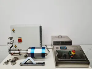 The WAB Agitator AK71M-2WKF Bead Mill Dyno Mill System, previously utilized in a university laboratory, is offered in excellent cosmetic condition. Although it powers up successfully and was tested with our testing cable, we are unable to perform comprehensive testing at our facility. Please note, the power cable is not included in this offer. This system features components manufactured by Elektromotorenwerk Brienz AG and STAHL-Fribos AG, reflecting high-quality engineering suited for high-precision laboratory milling applications.