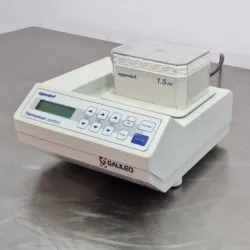 Eppendorf Thermomixer Comfort with block for 24 tubes of 1.5 mL. Digital display. Programable. Mixing frequency from 300 to 1.400 rpm. Orbit 0.3 cm. Temperature Range from ambient -13°C to 99°C. Heating rate 5 ºC/min. Cooling rate 3 ºC/min. Accuracy ±0.5 from 20 to 45, ±2 below 20 and above 45°C. Timer from 1 min to 9:59 hours or continuous operation. It shows some signs of heavy use. User manual. The Eppendorf Thermomixer Comfort with MTP block for microplates can mix and temper microplates at the same time. Applications include enzymatic reactions, transformation, DNA, RNA, and protein manipulation, bacterial cultures, immunoprecipitation, and hybridization, among others.