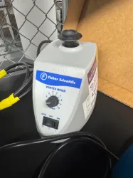 The Fisher Scientific Vortex Mixer is a benchtop laboratory instrument designed for rapid and efficient mixing of small liquid samples, essential in molecular biology, biotechnology, and clinical diagnostic workflows. This model features a speed control knob enabling variable mixing speeds, allowing precise handling of delicate samples commonly used in bioprocessing and synthetic biology applications. The device operates via a simple on/off switch for straightforward use and reliable performance in biochemical and cell imaging laboratories.