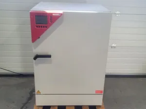 The BINDER CB210 CO2 Incubator / Drying Oven delivers precise and reliable performance for laboratory applications. With a nominal temperature capacity of 187°C and an internal volume of 210 liters, it provides a flexible temperature range from 7 to 60°C. This unit supports a CO2 range of 0 to 20% by volume with an adjustment accuracy of 0.1% and utilizes IR for CO2 measurement, ensuring optimal conditions for cell culture and incubation processes. The incubator operates on a nominal voltage of 230 V with a power frequency of 50/60 Hz, drawing a nominal current of 6.6 Amps. Featuring a large external dimension of 740 x 1069 x 715 mm and equipped with one main door and one internal glass door, the equipment is designed for ease of operation and integrity of internal conditions. Inside, it contains three perforated stainless steel shelves that offer durability and chemical resistance, each shelf measuring 556 x 444 mm. The chamber's internal dimensions are 560 x 750 x 500 mm, accommodating diverse laboratory needs. Weighing 121 kg, the unit is robust and stable. This model was manufactured in 2003 and has been tested under controlled conditions at 37°C with a CO2 level of 5% (recorded at 6.2%). Please note that the door has been slightly modified for padlock closure as shown in the available photographs.