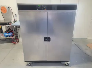 The robust temperature control system ensures very stable internal temperature conditions, with tests recorded at 36.2°C for a 37°C setpoint and 48.2°C for a 50°C setpoint, highlighting minimal deviation critical for sensitive applications like molecular diagnostics and bioprocessing workflows. External dimensions measure 119 x 75 x 161.5 cm, while the inner chamber dimensions are 103.5 x 60 x 120 cm, allowing ample space for sample processing, environmental tests, and dry heat sterilization widely adopted in synthetic biology and biomanufacturing research.