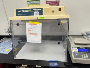 The AirClean 600 PCR Workstation by AirClean Systems is designed for PCR sample preparation with a controlled environment to minimize contamination. It features a clear front sash and a compact footprint suitable for laboratory benchtops.