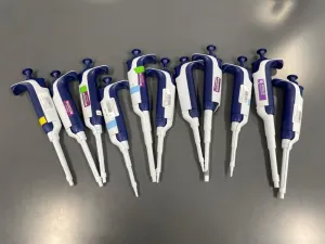 This lot includes 11 Rainin Pipet-Lite XLS single channel manual pipettes designed for accurate and reliable liquid handling in diverse laboratory settings. These manual micropipettes enable precise aspiration and dispensing of liquids without requiring electrical power or software control, making them ideal for molecular diagnostics, gene editing, and bioprocessing workflows.