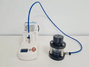 The Dolomite Mitos P-Pump Remote with Droplet Collector and Sensor was decommissioned from a university laboratory where it was deemed surplus to requirements. All units power on but have not undergone additional testing. The equipment is in reasonably good cosmetic condition, exhibiting minor marks from previous use. Included in this setup are the Dolomite Mitos P-Pump, Dolomite Mitos Sensor Interface, and Dolomite Mitos Flow Rate Sensor. The P-Pump model is 3200176_5, with a serial number of 4901379. The sensor carries a serial number of 1600878, ensuring integration within sophisticated laboratory settings.