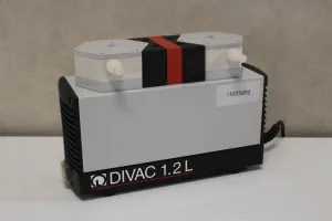 The Leybold Divac 1.2L Diaphragm Vacuum Pump is a robust, two-headed pump, uniquely designed for laboratory settings that demand chemical resistance and dry-running capabilities. It is ideally suited for a variety of laboratory applications, including transporting and evacuating tasks, without influencing the integrity of the medium involved. Ensure contamination-free operation with its 100% oil-free transfer system, perfect for handling vapors and condensates. This pump is particularly adept at managing aggressive and corrosive gases and vapors. Enjoy a maintenance-free, environmentally considerate design, boasting a flow rate of 20 L/min at atmospheric pressure. The working pressure stands at 1.0 bar, with an absolute final pressure of 8 mbar, and a maximum pumping speed of 1.2 m³/h. The Divac 1.2L embodies reliability and efficiency in a compact, user-friendly form.