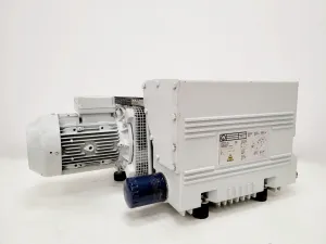 This Leybold Sogevac SV200 Single-Stage Rotary Vane Vacuum Pump was sourced from a university laboratory as surplus equipment. The unit is in good cosmetic condition with minor stains. It has been professionally serviced with fresh oil and new mist filters installed. The pump has been tested and operates efficiently at a vacuum level of 1.5 x 10 m/bar.